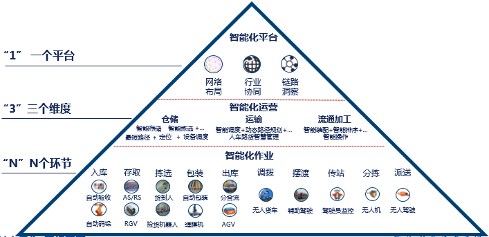 所謂“13N”智能化工作體系是指搭建一個(gè)智能化工作平臺(tái),從倉儲(chǔ)、運(yùn)輸、流通加工三個(gè)維度來運(yùn)營智能化產(chǎn)品,并從N個(gè)環(huán)節(jié)來實(shí)現(xiàn)智能化作業(yè)操作。