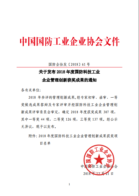 國防企協(xié)是由中國兵器裝備集團(tuán)、中國航天科技集團(tuán)有限公司、中國工程物理研究院等成員單位及管理專家組成的智囊團(tuán)體,是省部級國防科技工業(yè)企事業(yè)管理方面的咨詢參謀機(jī)構(gòu)。此次獲獎,是對公司管理創(chuàng)新成果的認(rèn)可,有助于公司持續(xù)提升經(jīng)營管理水平。此后,公司將繼續(xù)開展管理創(chuàng)新工作,為2019年公司高質(zhì)量發(fā)展添磚加瓦。