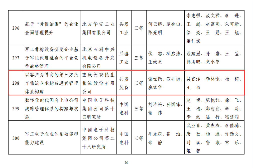 近日,長安民生物流又包攬了兩項大獎,“大型汽車物流企業(yè)以智慧物流轉(zhuǎn)型為目標(biāo)的人力資源體制機(jī)制變革”和“以客戶為導(dǎo)向的第三方汽車物流企業(yè)精益運營管理體系構(gòu)建”兩項管理創(chuàng)新成果,分別榮獲2018年度國防科技工業(yè)企業(yè)管理創(chuàng)新成果二等獎、三等獎。