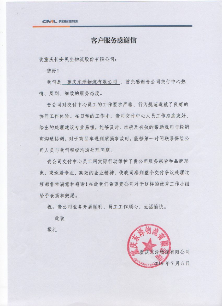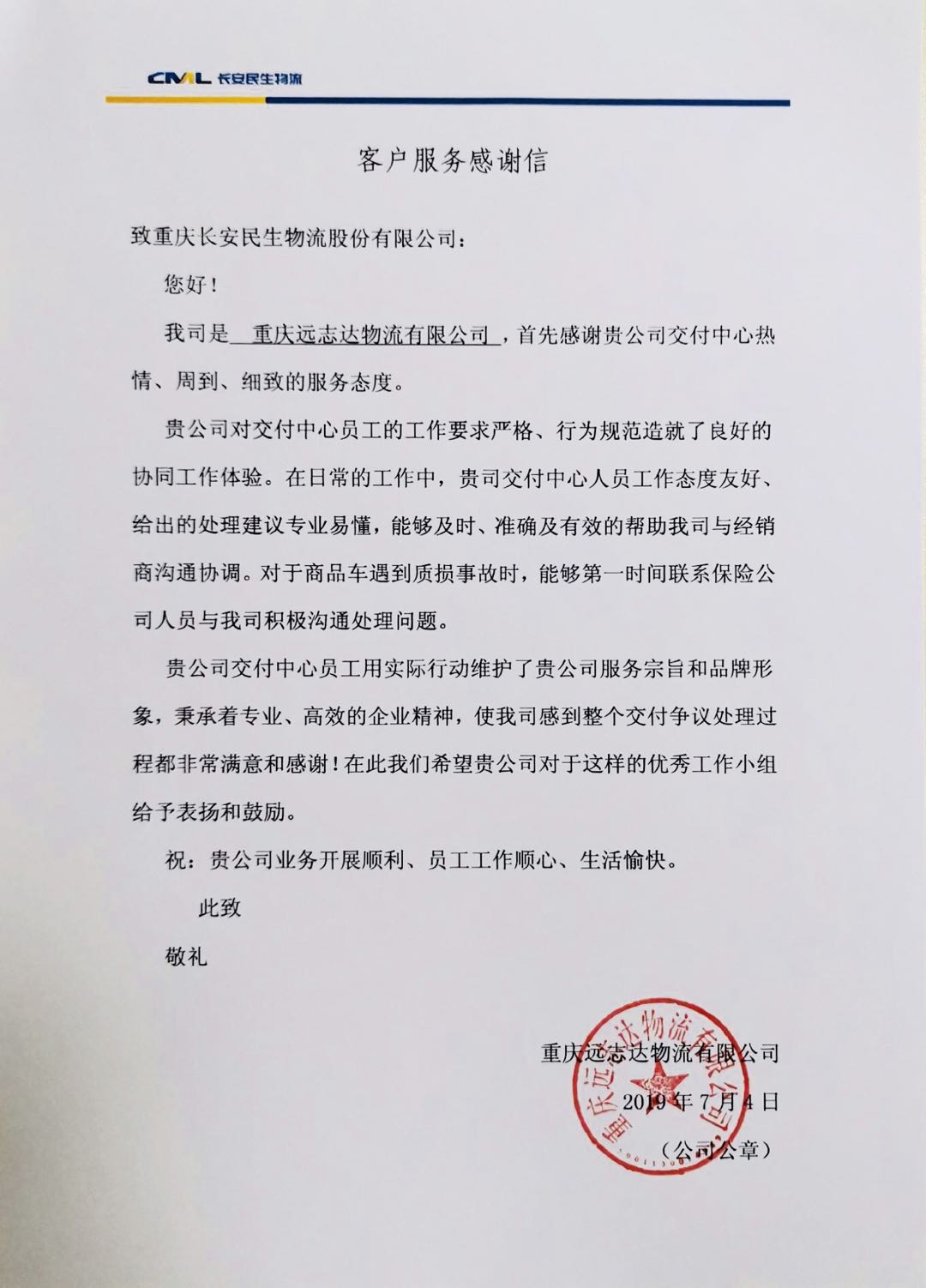 兩封沉甸甸的感謝信,足以表明客戶對我們的信任??蛻舻男湃尉褪情L安民生物流人永不停歇的動力與支撐??蛻舻臐M意程度就是我們奮斗的不竭動力。