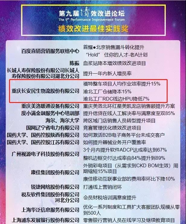 經(jīng)過國際高標準的層層選拔,長安民生物流憑借整車事業(yè)部“福特整車項目人均作業(yè)效率提升15%”、零部件事業(yè)部“渝北工廠倉儲降本15%”、“渝北工廠RDC線邊HPU降低7%”3個課題斬獲 “績效改進最佳實踐獎”。