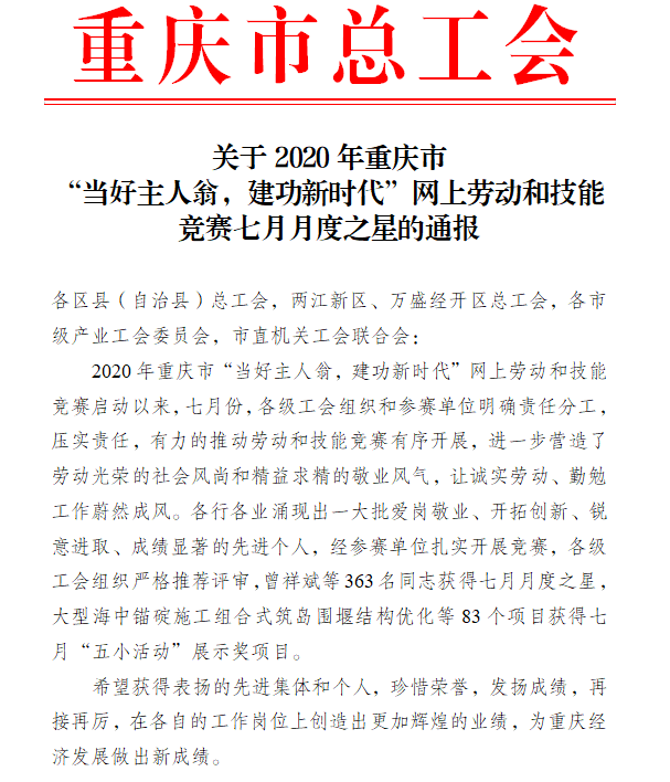 “賽工匠,勞動美。”自7月20日半年度干部大會召開以來,公司各級工會組織全體員工貫徹落實(shí)會議精神,以戰(zhàn)時(shí)思維、戰(zhàn)時(shí)狀態(tài)、戰(zhàn)時(shí)作風(fēng)、戰(zhàn)時(shí)行動,投入到生產(chǎn)經(jīng)營各項(xiàng)任務(wù)當(dāng)中,積極參加重慶市“當(dāng)好主人翁,建功新時(shí)代”網(wǎng)上勞動和技能競賽,穩(wěn)拿六項(xiàng)殊榮。