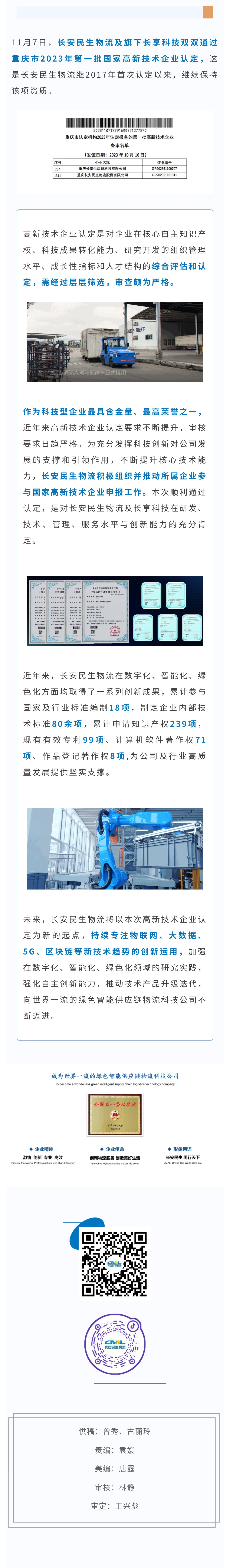 雙黃蛋!長(zhǎng)安民生物流及長(zhǎng)享科技獲得國(guó)家高新技術(shù)企業(yè)認(rèn)證