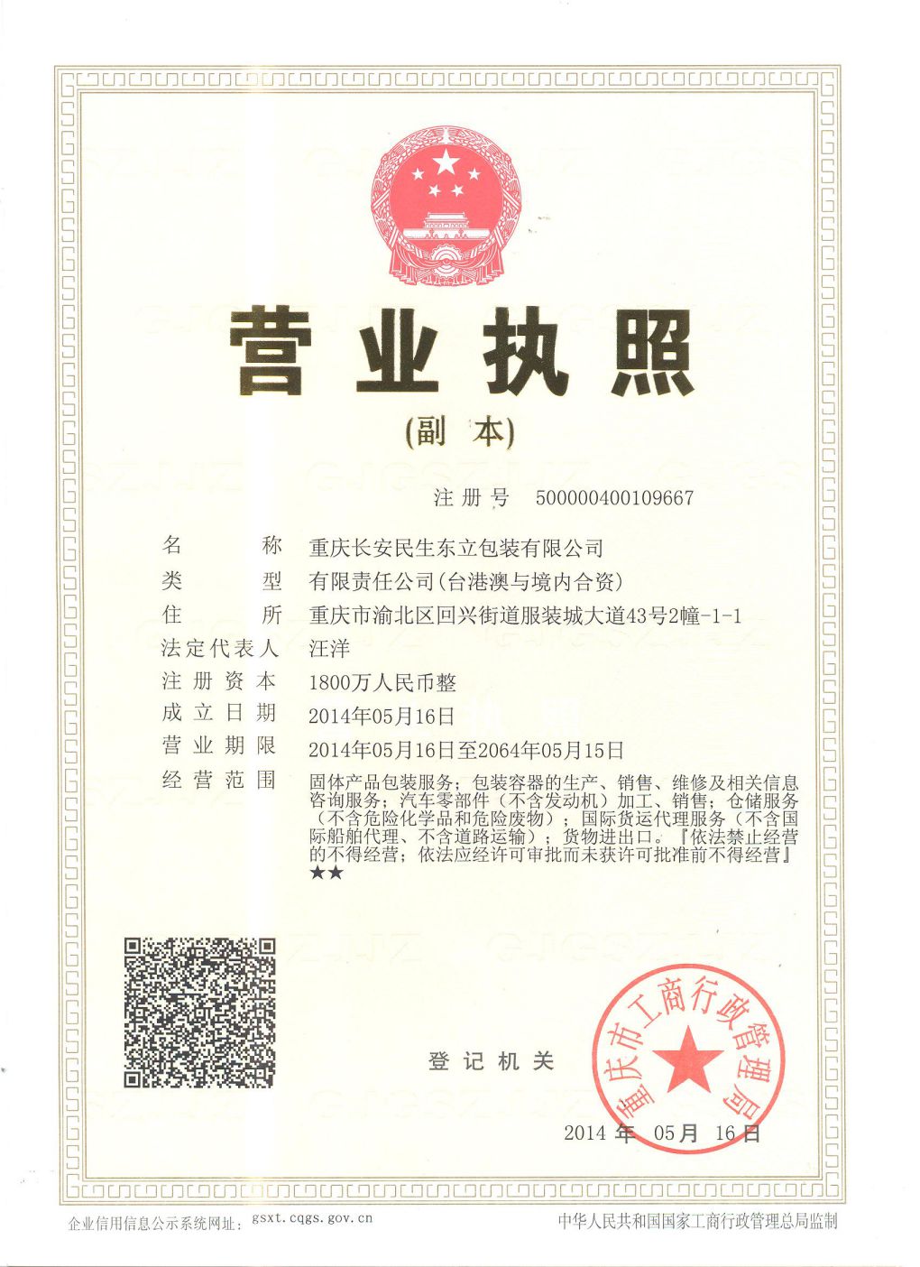 2014年5月16日,重慶長(zhǎng)安民生東立包裝有限公司(以下簡(jiǎn)稱“東立包裝公司”)正式成立,東立包裝公司由公司與東立物流股份有限公司(臺(tái)灣)(簡(jiǎn)稱“東立物流”)合資組建,注冊(cè)資本1800萬(wàn)元,主要為長(zhǎng)安福特、長(zhǎng)安汽車及其相關(guān)汽車零部件供應(yīng)商提供汽車零部件、整車包裝服務(wù)。