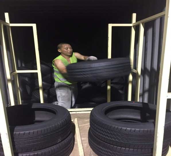箱門一打開,一股股熱浪迎面而來,沒有遲疑,黃時倫一頭扎進“桑拿房”內(nèi),把燙手的輪胎一條條整齊地堆碼在周轉(zhuǎn)車上。輪胎與輪胎之間縫隙小、摩擦大,在碼垛過程中拿取輪胎十分費力,汗水早已浸透衣服,額頭的汗珠也不時從眉梢滑落至眼睛里,他用手擦擦額頭的汗水,繼續(xù)把輪胎一條一條的取下、裝載、搬運…